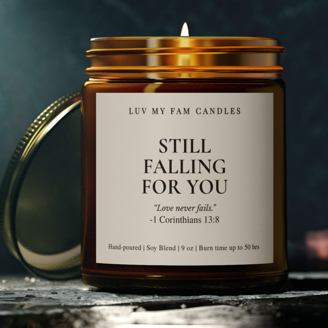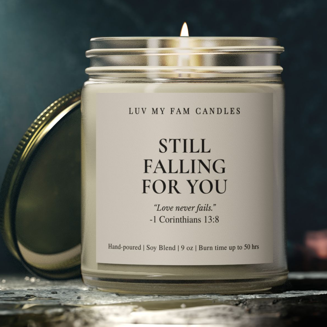Still Falling for You – 1 Corinthians 13:8 Candle with Scripture | 9oz Coconut Apricot Wax