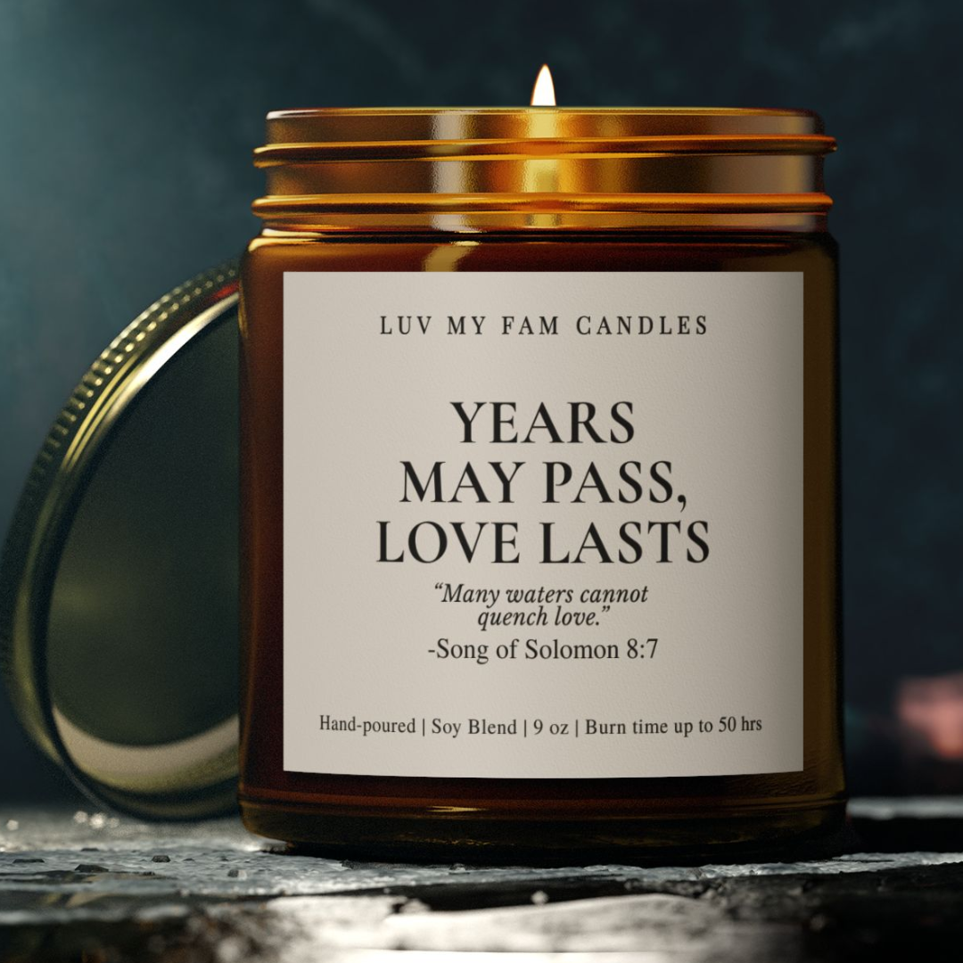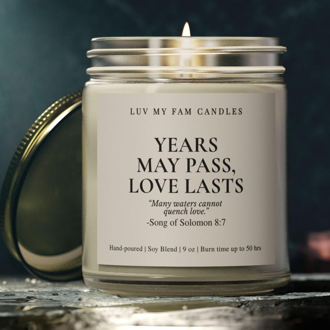 Years May Pass, Love Lasts – Song of Solomon 8:7 Candle with Scripture | 9oz Coconut Apricot Wax